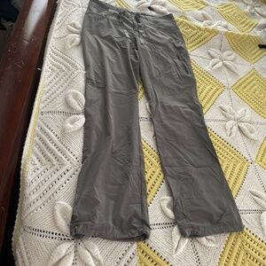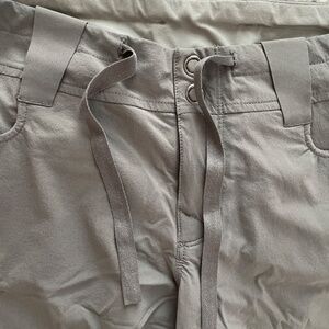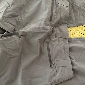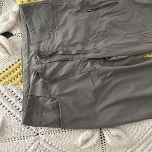 These are lightweight excellent hiking pants from outdoor research. Two hand pockets, a side, zipper pocket and two zipper rear pockets. The cuffs have a nicely hidden stretchy element that will let you convert them to capris if needed. The condition is great. See photos for measurements, but it’s about 29 inch inseam and 14 1/2 inch waist.