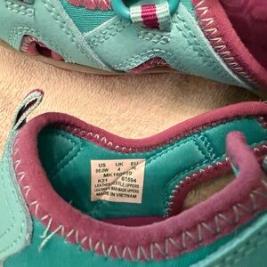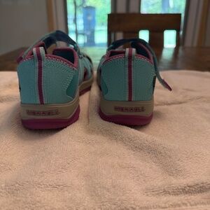Brand new. Never worn. Does not have the price tag but has another tag still on it. Pretty aqua and teal color. Velcro strap.