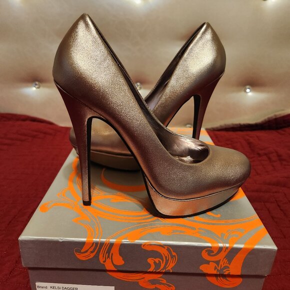 Women's size 6.5 Pewter Pumps. Metallic finish with 5.25" heel and GENUINE leather. Manufacturer: Kelsi Dagger. Model: Lizzy. In original box with original packaging. Wear something none of your friends have....this great metallic silver/pewter closed toed pump.