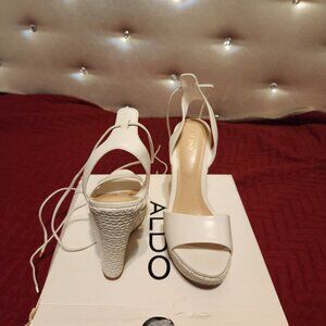 Women's size 7 Aldo wedge heels. Model: Lariladia. 5.5" heel with 1.5" platform. New, never worn, in original box with original packaging. Gorgeous white platforms with a little extra as these have a tie up that goes up the calf.