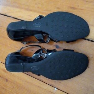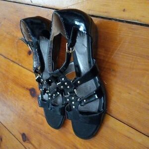 Women's size 8, black patent leather SOFFT ankle strap sandals.