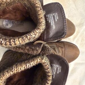 Excellent condition. Looks like suede and the material at the cuff is super soft. No tread wear.