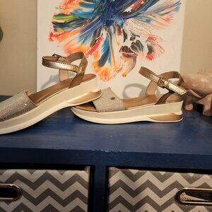 Ladies size 9 bronze and cream colored sandals. Bronze color is shimmery while cream under color is matte. Rainbow colored jewels on the strap that goes over the front of the foot with a small juicy crown pendant. Outer material is a textile that's smooth and inner material is a faux leather. Ankle strap with bronze colored buckle. Sole of sandal is slightly elevated and is about 2 inches high in back.