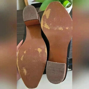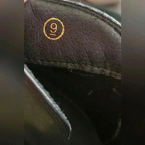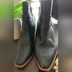 Women's black ankle heeled boots with side zipper and side buckle design. The top of the boot has a stitched design. These boots are a size 9, used but in very good condition. There are a few smudges as seen in the photots.