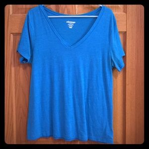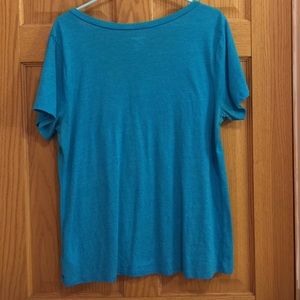 Women's v-neck tshirt size XL from Old Navy. Has been worn, but there is no pilling under the arms. There is a bit of shimmer from deodorant but I will try to wash it out. Other than that, no marks, tears or stains. Very pretty aqua blue color, best seen in first pic.