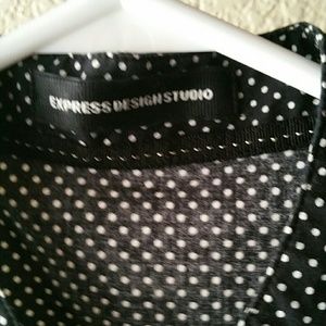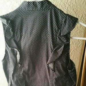 This black and white polka dot blouse is professional with a feminine flare! The ruffles on the front and back lay flat after a quick ironing