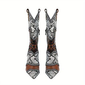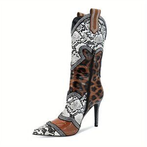 Women's slim high heels, color blocked rhinestones, winter midsole boots