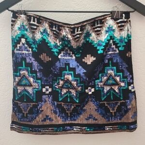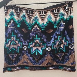 ICU Festive aztec/art deco sequin mini skirt EUC black, hyacinth/periwinkle, tan, aqua. Elastic waistband and lined. Fits TTS. Aztec art deco sequin mini skirt EUC black hyacinth elastic waistband