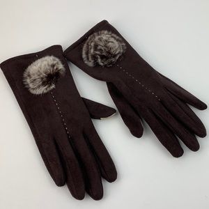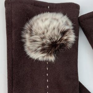 Women’s smart touch brown fleece fashion winter gloves with faux fur puff
