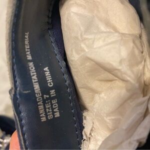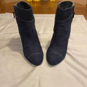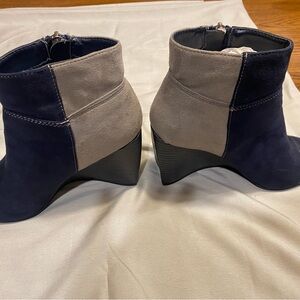 Navy/gray Somona boots. Size 7 suede like material. These boots has the one scratch mark on the side, shown in picture and a stain on the back of the heel with some scratch marks.