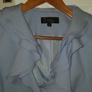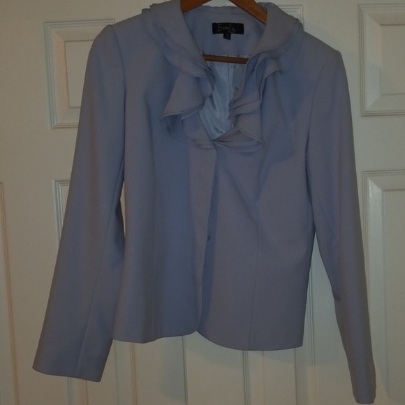Gorgeous baby blue skirt with jacket. Delicate ruffles at the neckline. Excellent condition. Work one time for 2 hours. Lost weight and it doesnt fit. Beautiful addition to a professional wardrobe