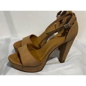 Preowned minimal wear , light scuffing on toes. The product is a pair of women's size 8.5 cone chunky beige high heels with an open toe and ankle strap. These shoes are perfect for a variety of occasions including travel, casual wear, and workwear. The ultra-high heel and platform style add a touch of sophistication, while the solid beige color and nubuck upper material give a chic and stylish look. The ankle strap closure and rubber outsole provide comfort and support, making these heels a versatile and fashionable choice for any outfit or occasion.