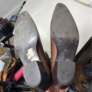 These classic leather Western cowboy boots feature intricate stitching and a solid heel for style and durability. Perfect for adding a touch of rugged sophistication to any outfit. Thick chocolate brown leather is beautiful with a few small water spots at the toes and darkening on the pull on straps. Heels do show a bit of heel drag wear. Brand often sold at Anthropologie.