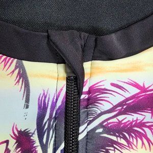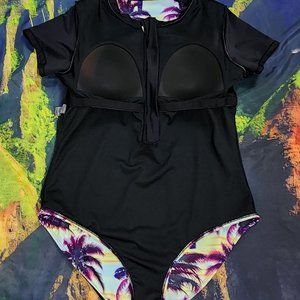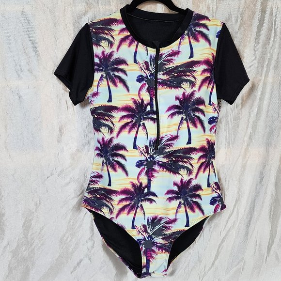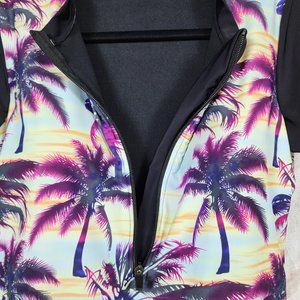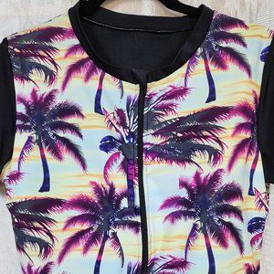 Women's sz XL Zip Front Palm Tree Print Short Sleeve Swim Suit - EXCELLENT