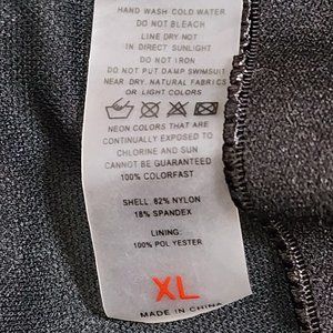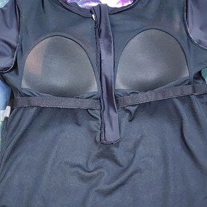 Like new excellent condition on this super cute size XL zip front, short sleeve rashguard swimsuit with purple & violet palm trees on light blue background! No chafing rashguard top suit is fully lined in no show-thru black with built in molded cup bra - SO COMFORTABLE! There's no damage or flaws on this like new suit. Please see the detailed photos for exact condition and cuteness. This item freshly laundered prior to taking photos & measurements. Measurements are approximate, taken with garment lying flat & doubled as necessary.