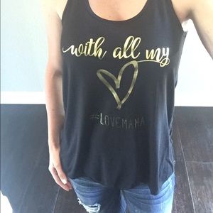 Black flows racerback tank with (gold) lettering. From Dashbo & Co.