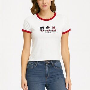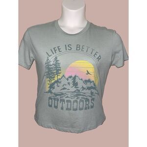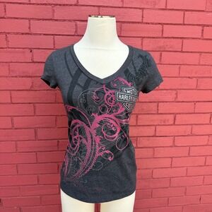 Slight pilling on this gently used women’s graphic tee. Mauve color with white print. Size S shortsleeved t-shirt. Approximate Measurements (laying flat): Bust: 18” Length: 27” • 50% polyester 25% cotton 25% rayon.