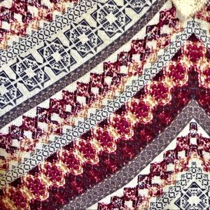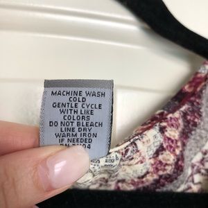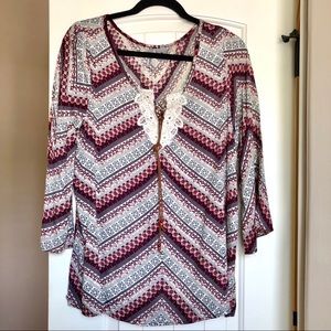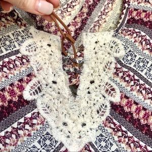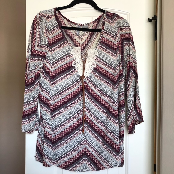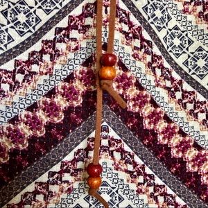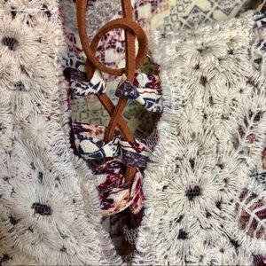 Women’s rayon v/neck top with leather tie detail in lace with beads on front.