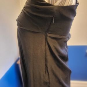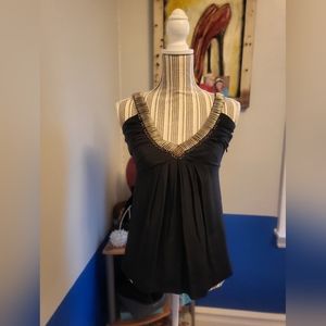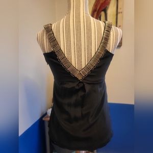 Great black top with silver metal rings for an added flare. There is an underarm zipper, which makes it easy to put on.Goes great with jeans for an evening out. Fabric is 100% silk and it's very gently worn.