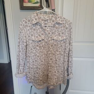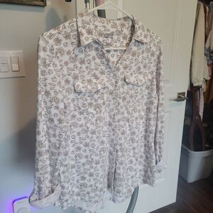 This is a set of two women's tops in size S. They feature a v-neck with collar, soft roll tab sleeves, and are made from a cotton poly blend material. The tops are from the brands Croft & Barrow and Eden & Olivia, and come in a multicolor style. They are basic button-up tops suitable for everyday wear. Each have 2 pockets on chest area. Great basic work tops.