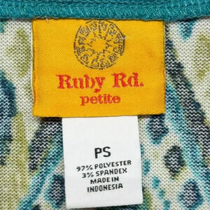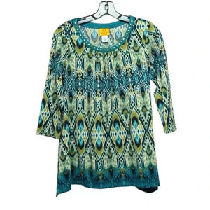 women’s tunic top features a bohemian print with a combination of geometric and paisley patterns. The shades of blue, green, yellow, and white create an eye-catching design. The top has a scoop neckline with a small V-cut detail and three-quarter length sleeves.