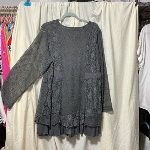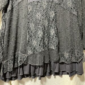 This is a very feminine dark gray tunic. Lots of crochet patterns. It is a double layer top. It has no rips, tears, snags or stains. It has been gently worn only a few times. It comes from a smoke free home. All used clothing items are washed, dried, fluffed and folded before shipping.