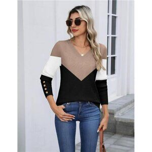 Features: Women pullover sweater, Tight ribbed long sleeves, V-neck design. The ribbed knitted block pattern, the button decoration on the cuffs (reinforced and non-removable).