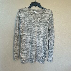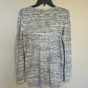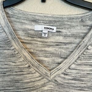 Sonoma women’s sweater in a size medium. This is from Kohls and is a thin v neck sweater in a black, gray and white pattern.
