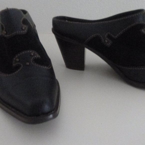 Blue western boot clog. Pointed toe. Suede upper/rivet decoration. Heel 2 inch. Size:7