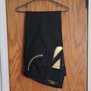 Women's wide-leg bell bottom blue jeans w/gold patches, made of cotton/polyester/spandex, size 9-10, vintage.