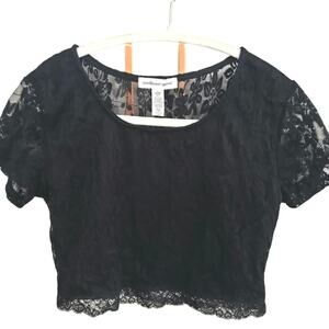 Whimsigoth lace black women's size large crop top lightweight nylon spandex blend, versatile can be worn Witchy Rave Punk pirate this top could be dressed up and chic or could be added as a layer with your own v Style perfect for the season and used pre-owned condition no major flaws it does have an underlining tank material over the core under the lace see photos for extra description