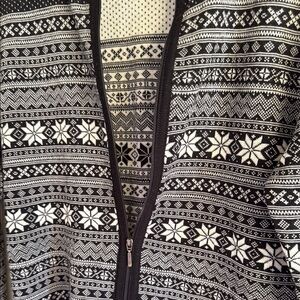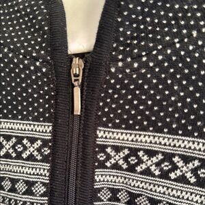 Embrace the cold with this stylish cardigan featuring a classic Nordic pattern in black and gray. The full-length zipper and thick knit material ensure warmth and comfort, making it perfect for winter days. Solid black accents at the collar, cuffs, and hem add a touch of elegance to this cozy garment. This is a perfect weight for layering High quality wool with timeless fit and design