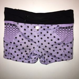 Black and purple pocka dotted workout shorts with side pockets