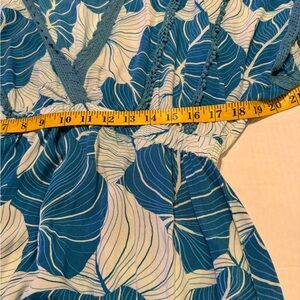 America & beyond flattering blue Palm leaf tropical v neck , stretch waist , short sleeve mini dress with crochet hem detail. Worn once on my beach vacation as a Swimsuit cover up. Great for luau party, cruise or beach vacation. Size xl