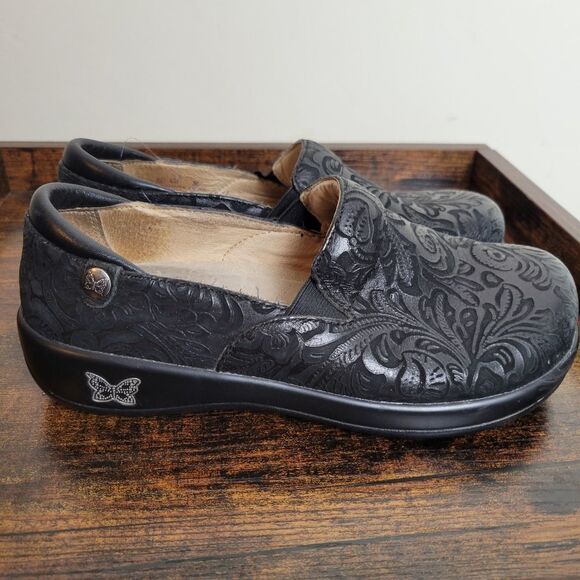 The Alegria Keli Professional Black Emboss Paisley brings a little pizzazz to your basic black loafer. The elastic goring at the instep and padded collar provide an extra comfortable fit. It also features the patented Alegria insoles made of cork, memory foam and leather covered latex. This combination allows the insole to form to your foot creating a custom fit and amazing comfort.
