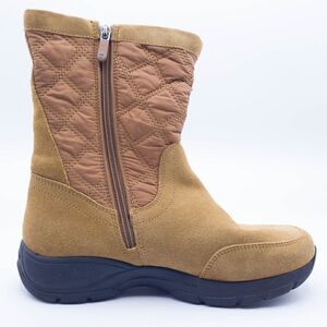 Suede lower with quilted upper, these boots come approximately mid-calf in height with a zipper for easy on/off.