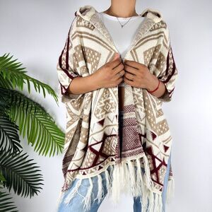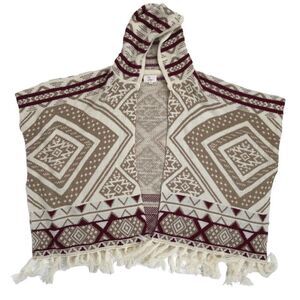Trim fringe, short sleeves, hood, tan and burgundy colors. This is such a warm and cozy piece for the fall, winter, and spring! It's perfect for layering and is comfy. In excellent condition.
