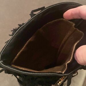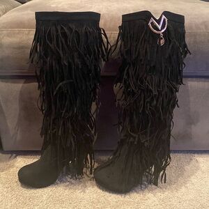 Women’s Black Fringed Tassel Faux Suede High Heel Knee High Stiletto Boot that Slips On/Pulls On. These boots are not the highest quality boots but are cute and fun!