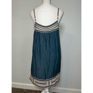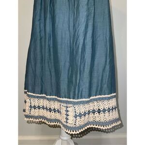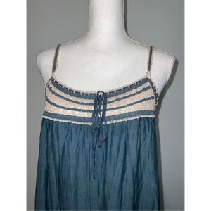 Women’s Blue Crochet Cottagecore Silk/cotton blend Strap Dress size Small/medium. Fully lined. Adjustable straps. Missing brand tag. I think it’s Banana Republic.