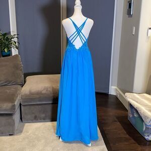 Women’s Blue Prom, Party or Bridesmaid Dress Full Length with Leg Slit and pretty back straps that are adjustable