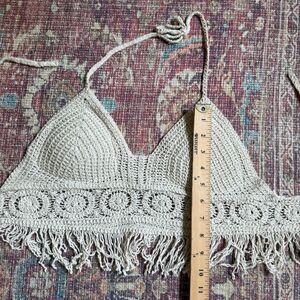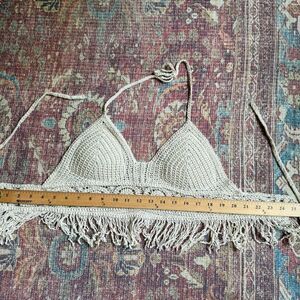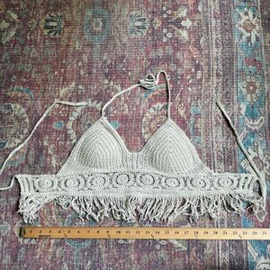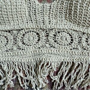 Elegant crochet crop top with fringe detailing in a soft cream color. Perfect for layering or wearing on its own for a boho-chic look.
