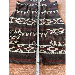 Boho knit mini dress or tunic in brown red white geometric pattern, button front, two flap pockets, approx pit to pit 17” length 26”, unbranded, can be worn alone or layered, very good condition.
