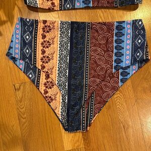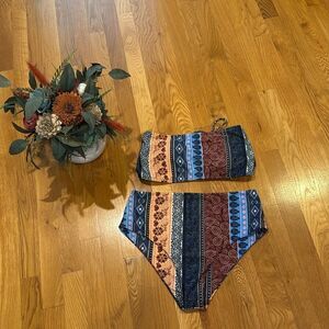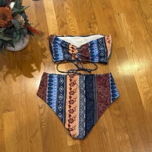 Stylish strapless bikini with a boho pattern. Features a mix of red, blue, and cream colors.