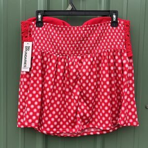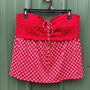Features: Ruched crochet bust; foam cups are not removable; straight peplum hem