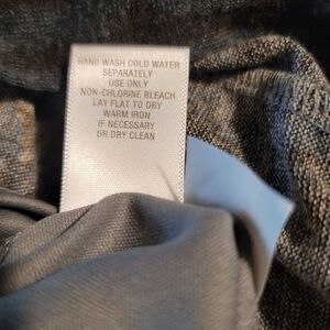 Knit body lined scoop neck 3/4 ruffle cuff tea length pullover dress in dark gray, rust, black and blue scroll print by Dressbarn.