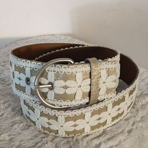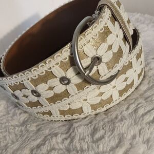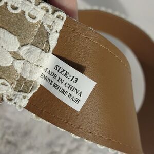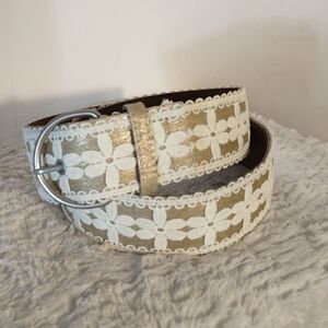 This gold vegan leather with crocheted floral lace women's belt is a size 13 and measures approximately: 42" x 2". In like new condition. All offers are welcome.