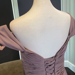 Women’s Full Length Chiffon Bridesmaid Party or Prom Dress with Leg Slit. It is hard to capture the sleeves properly with the armless dress form. The sleeves kind of drape on the arm/shoulder, do not sit fully on the shoulder from what I can see.