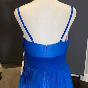 This Dress is just beautiful. It is Chiffon with Spaghetti Straps and a Sweetheart Neckline. The color transitions from a stunning blue to a bright white. The straps are adjustable, with a zip up back.
