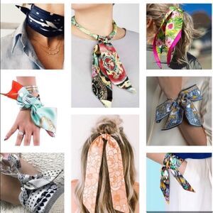 Narrow scarves for many uses including hair ties, handbag highlights and fashion neck ties.