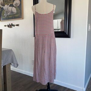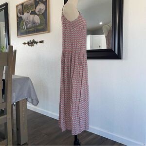 This maxi dress is a must-have for your summer wardrobe. It features a geometric print in a red and blue color palette, a scoop neckline, and a sleeveless design. This beautiful dress is cut to a midi length, perfect for pairing with sandals and a denim jacket for a stylish day look. Made in a size medium, this maxi dress is sure to become one of your favorite pieces.